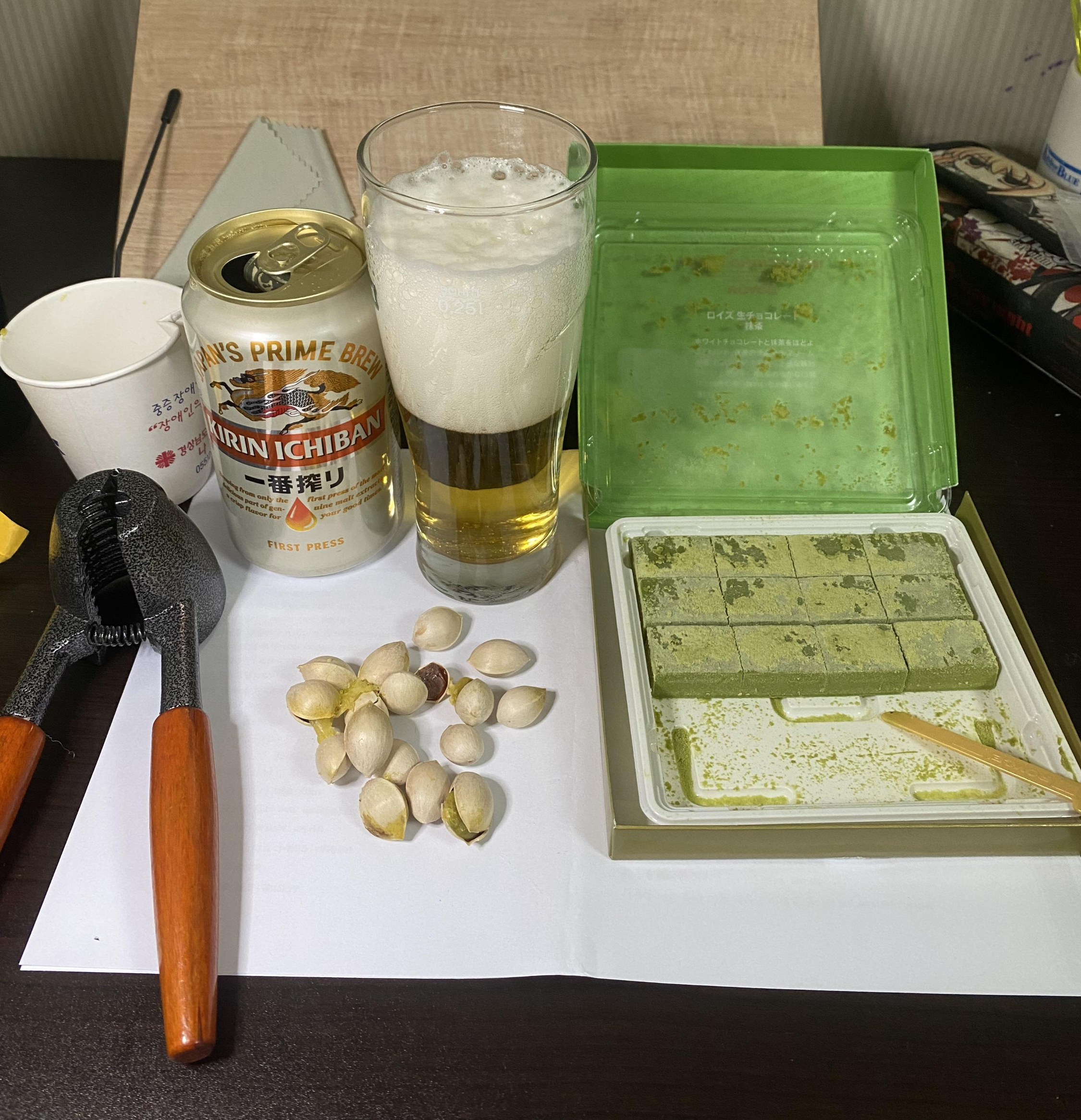이번의 안주는 로이스초콜렛 녹차맛 과 은행씨앗을 안주로 기린이치방을 한잔 하기로 하였습니다.