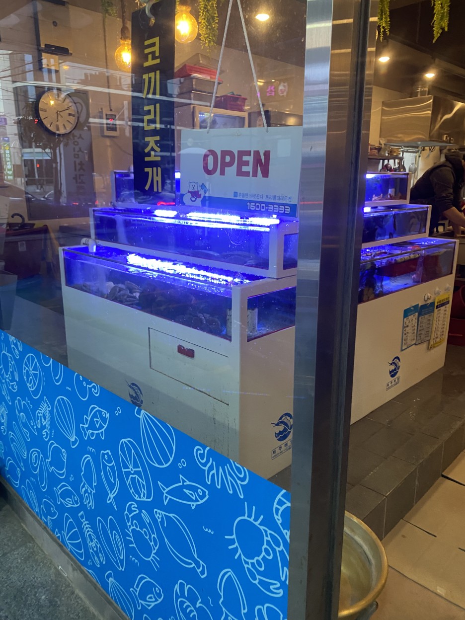 각종 해산물들이 수족관에서