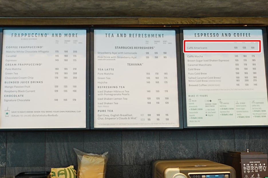 아메리카노 T는 120바트로