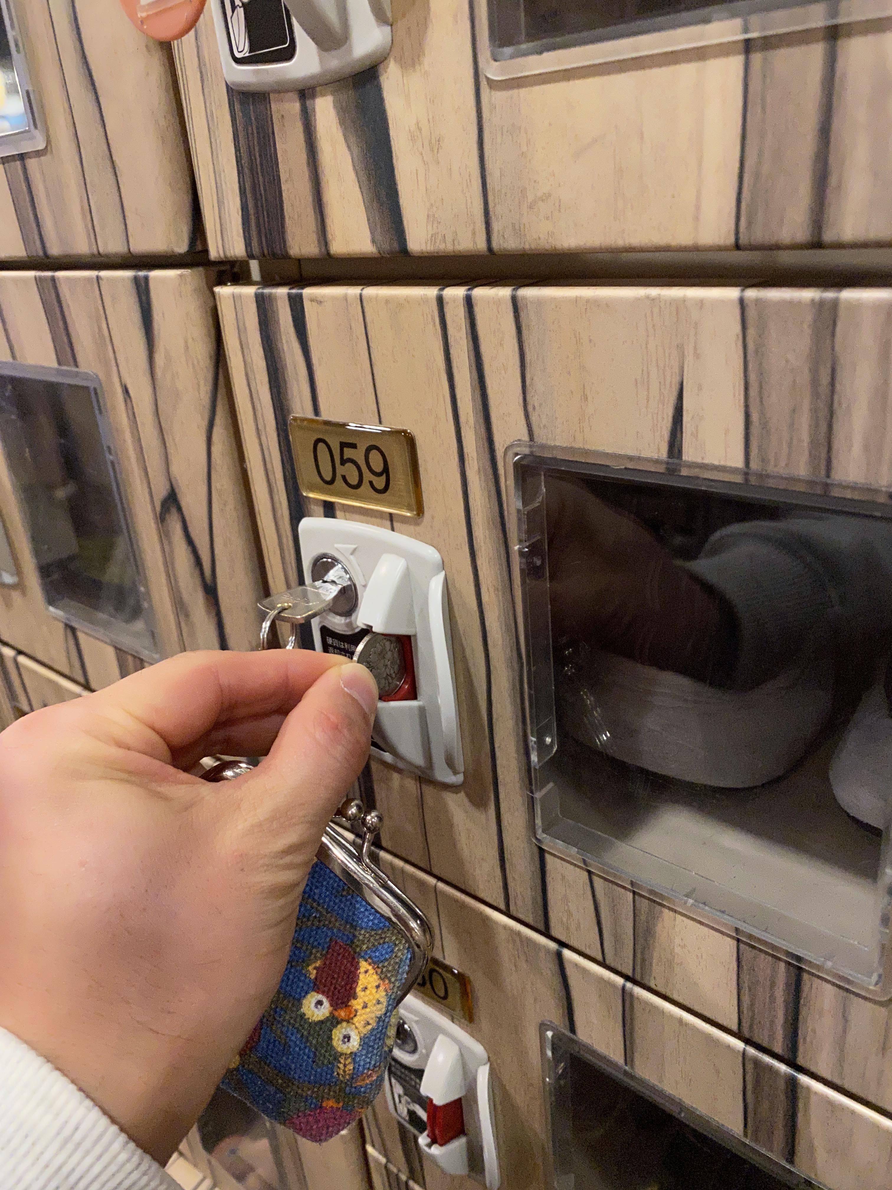 신발장에 100엔 동전을 넣고 돌려야 신발장 키를 뽑을수 있습니다,